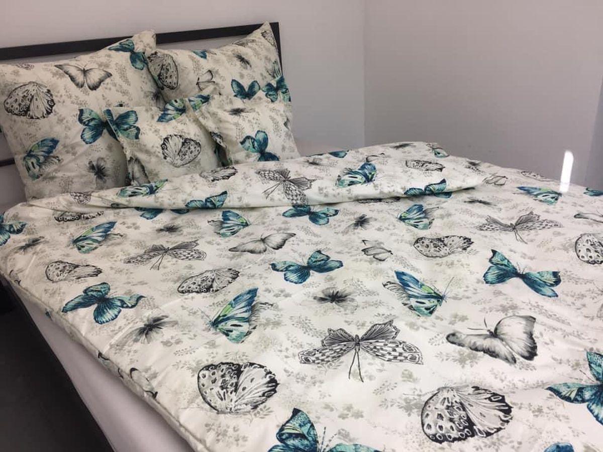 Elegancka pościel bawełniana, ozdobiona delikatnym motywem turkusowych motyli na jasnym tle.