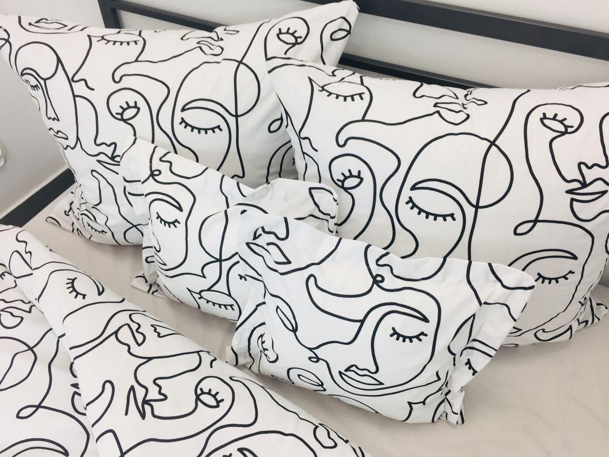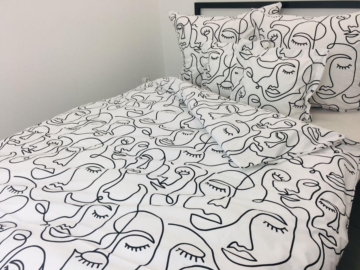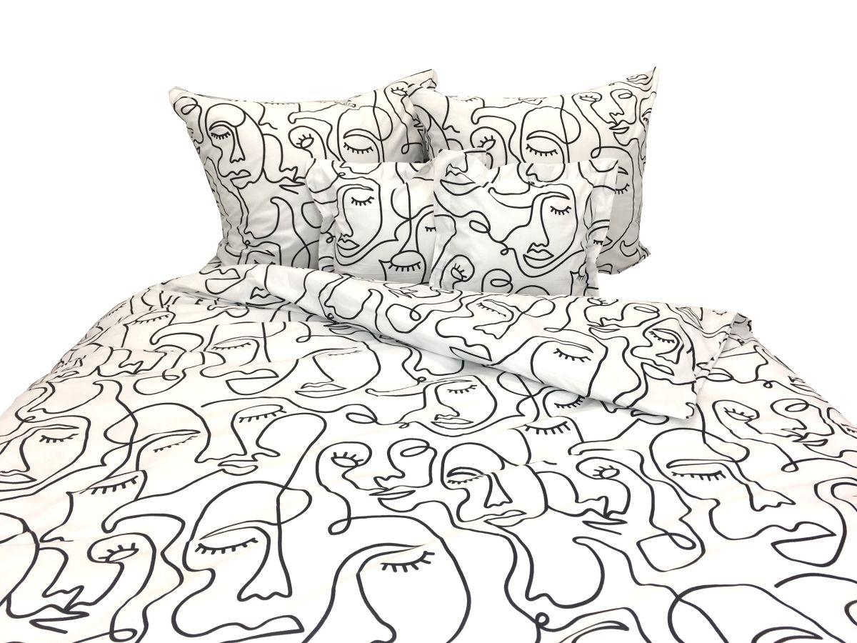Nowoczesna pościel bawełniana, zdobiona artystycznym wzorem twarzy na białym tle. Wykonana z wysokiej jakości polskiej bawełny, zapewnia komfortowy sen, przewiewność i trwałość. Doskonała do sypialni w stylu minimalistycznym lub współczesnym, wprowadzając do wnętrza elegancki i oryginalny charakter. W zestawie poszewka na kołdrę oraz dwie poszewki na poduszki.