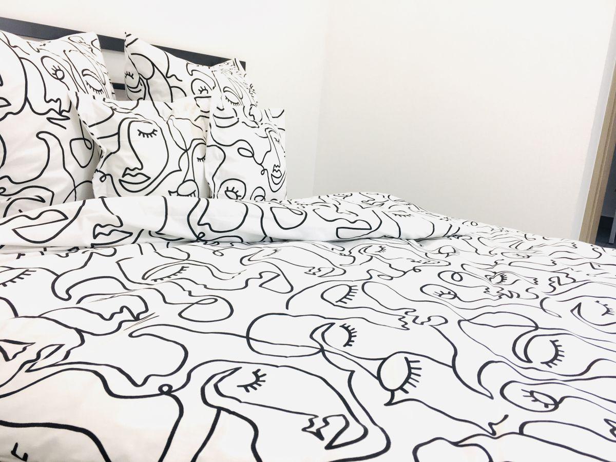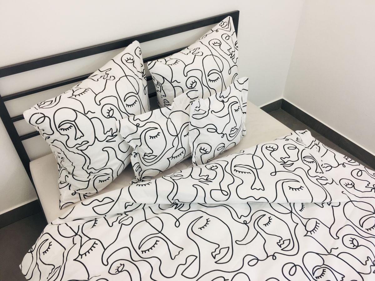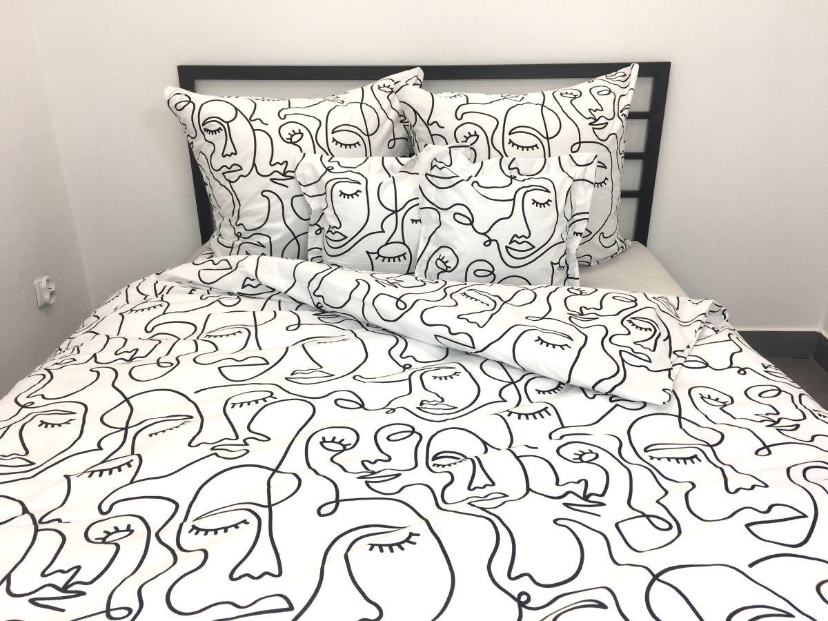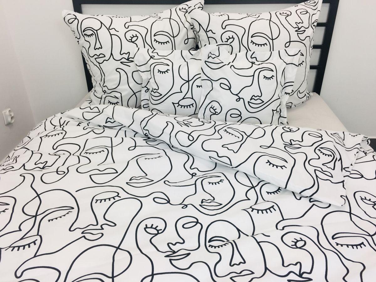 Nowoczesna pościel bawełniana, zdobiona artystycznym wzorem twarzy na białym tle. Wykonana z wysokiej jakości polskiej bawełny, zapewnia komfortowy sen, przewiewność i trwałość. Doskonała do sypialni w stylu minimalistycznym lub współczesnym, wprowadzając do wnętrza elegancki i oryginalny charakter. W zestawie poszewka na kołdrę oraz dwie poszewki na poduszki.